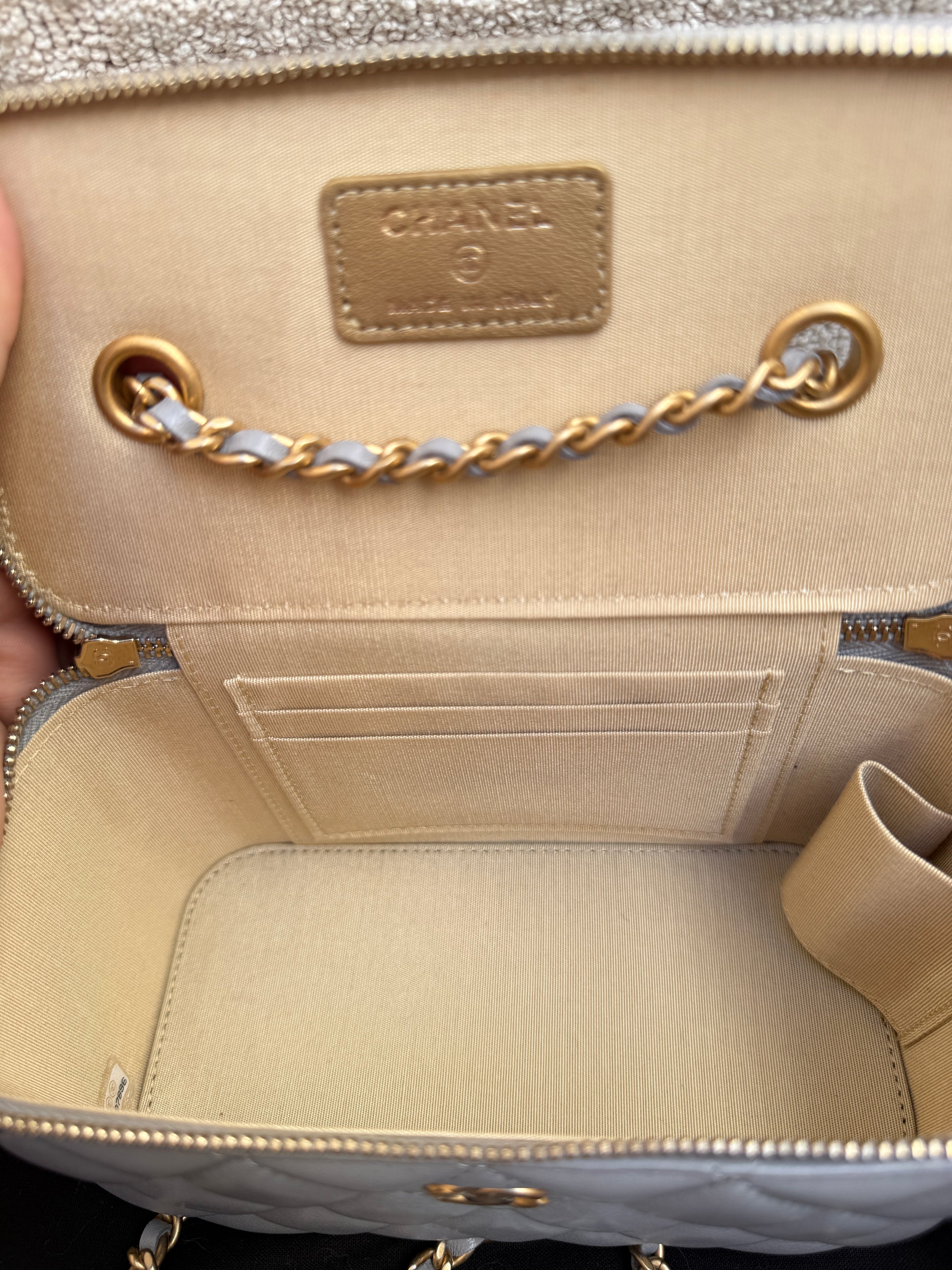 This is an authentic preowned CHANEL Lambskin Quilted Small Pearl Crush Vanity Case With Chain in Grey. This stylish crossbody/shoulder bag is crafted of luxurious lambskin in grey. It features a leather threaded aged gold chain-link shoulder strap and aged gold hardware. The handbag features a 3/4 wrap-around zipper that opens to a metallic gold fabric interior with card slots.6.5 x 4 x 3 inches