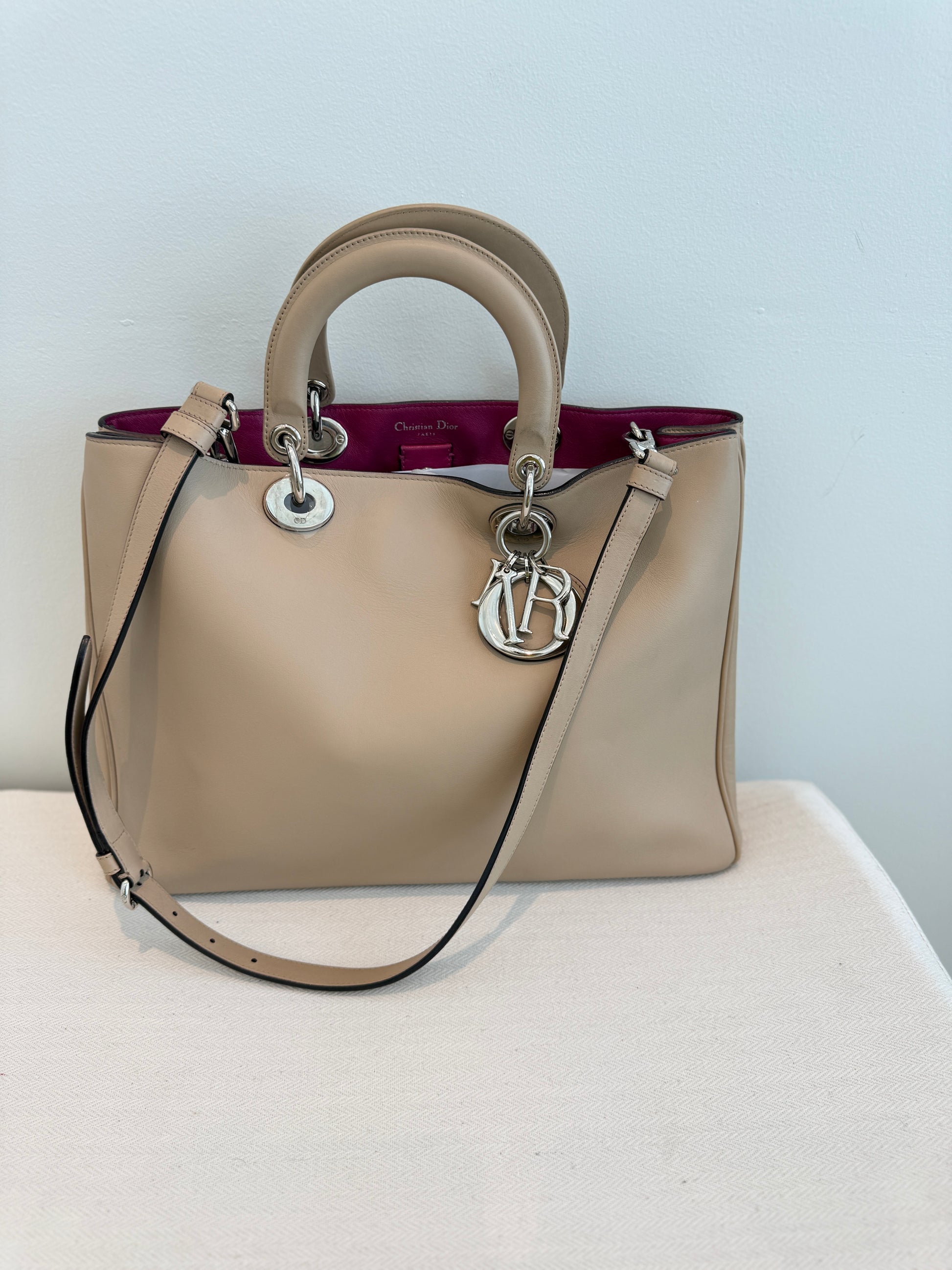 This is an authentic pre-owned CHRISTIAN DIOR Diorissimo Tote in Beige. This gorgeous Like New tote is crafted of beautiful leather. The bag features reinforced calfskin beige leather top handles with silver links and an optional leather crossbody strap with silver clasps. The top is open to a hot pink leather interior with patch pockets and a removable pouch.