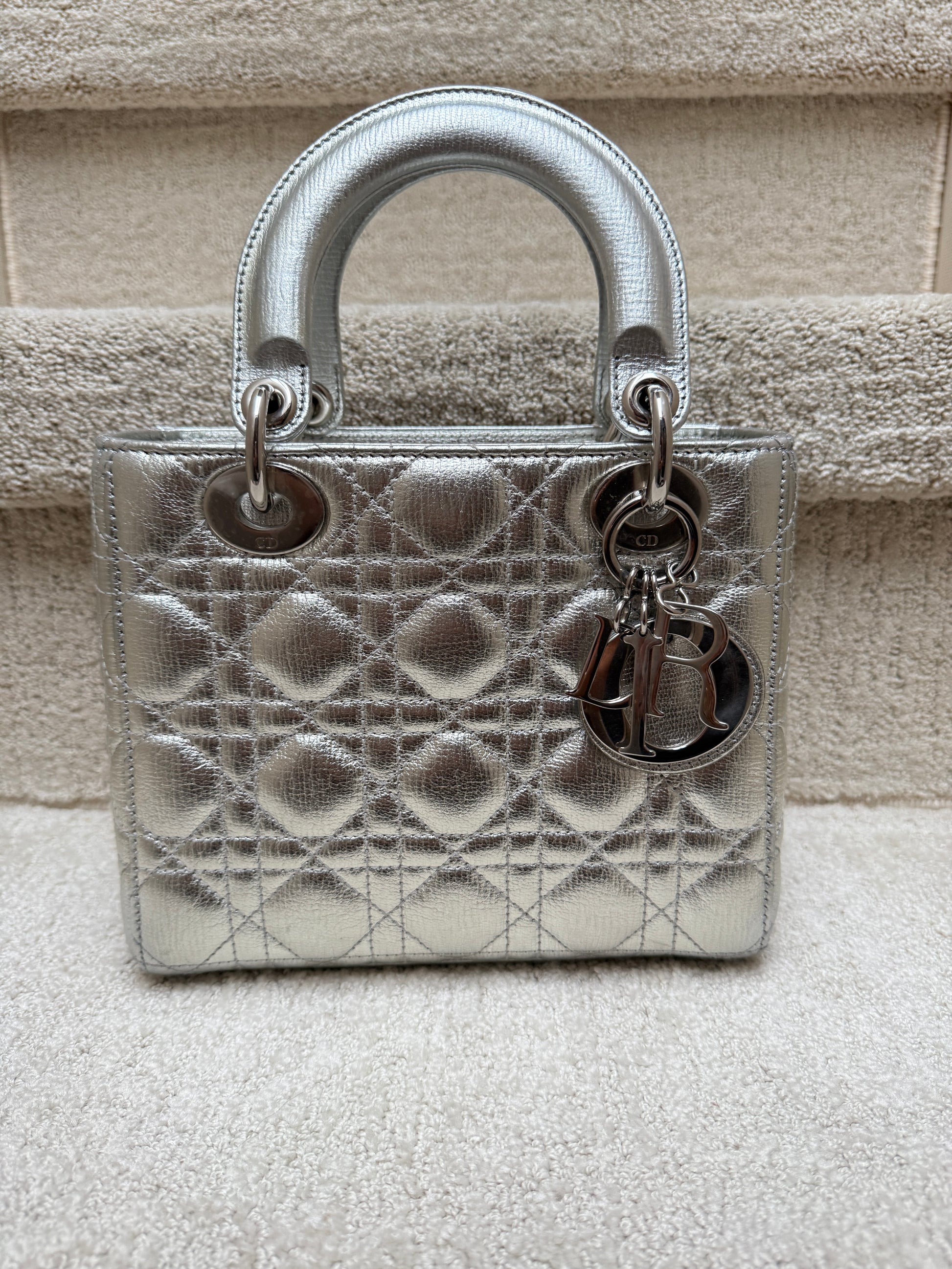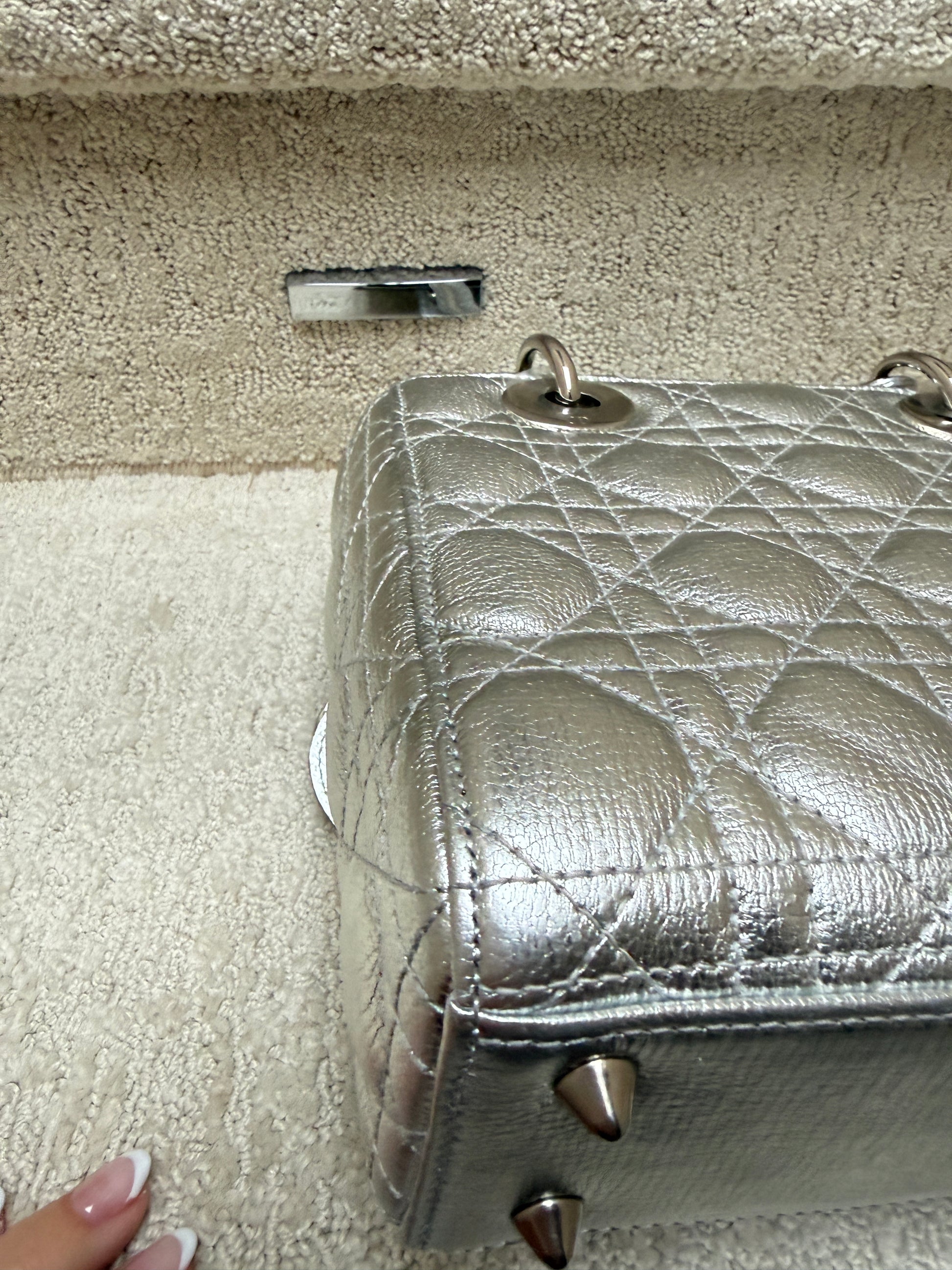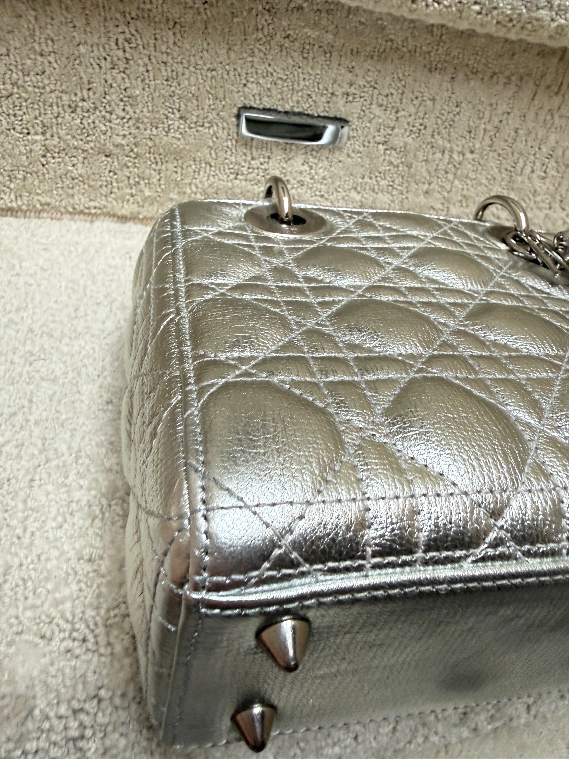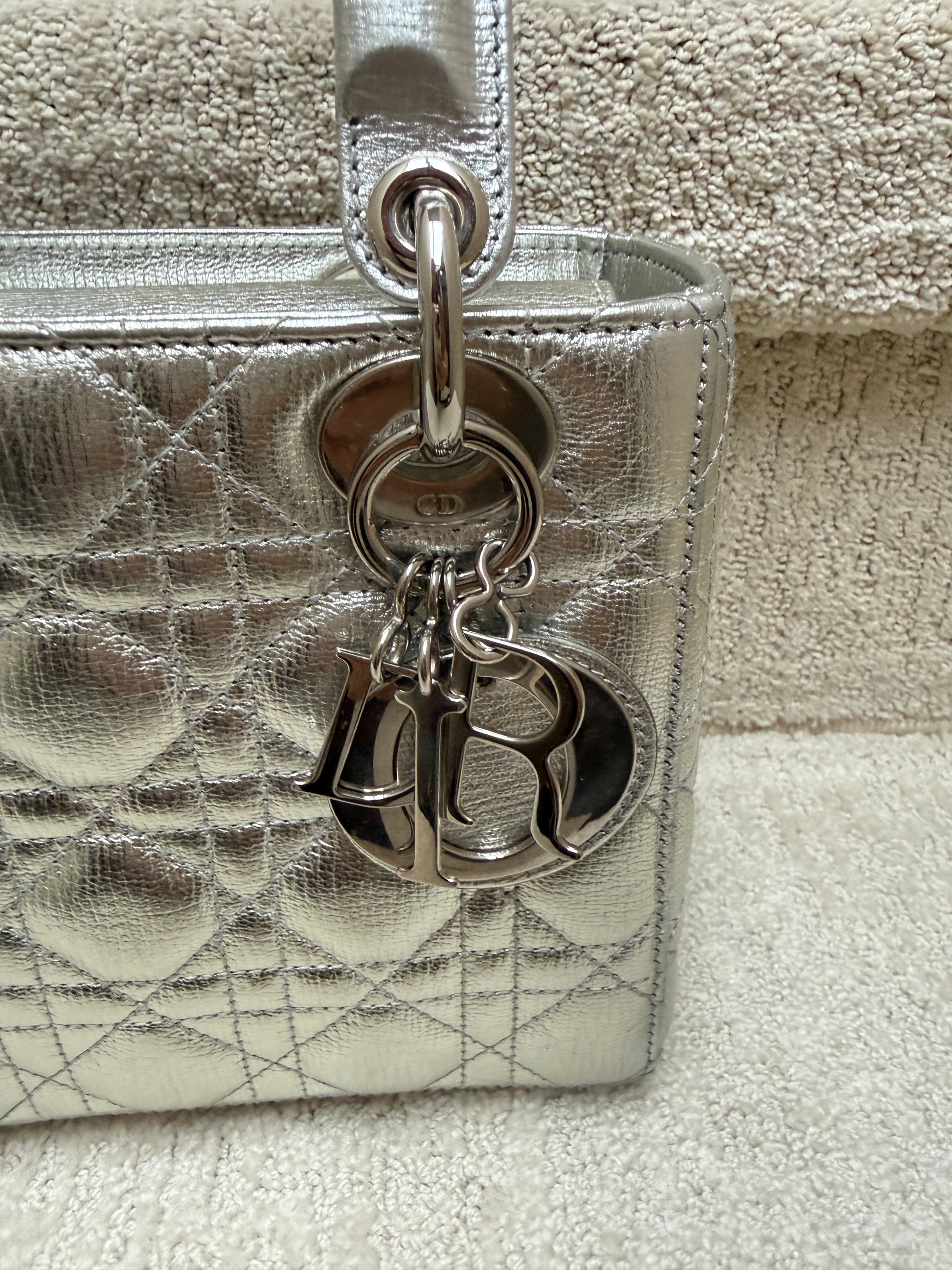 This is an authentic preloved CHRISTIAN DIOR Lambskin Cannage Small My ABC Lady Dior in Metallic Silver. This chic tote is crafted of silver cannage quilted lambskin leather. The bag features a wide leather optional shoulder strap with 3 lucky bag charms, and sturdy leather top handles with silver hardware including hanging Dior logo charms. The top flap opens to a blue leather interior with zipper and patch pockets.