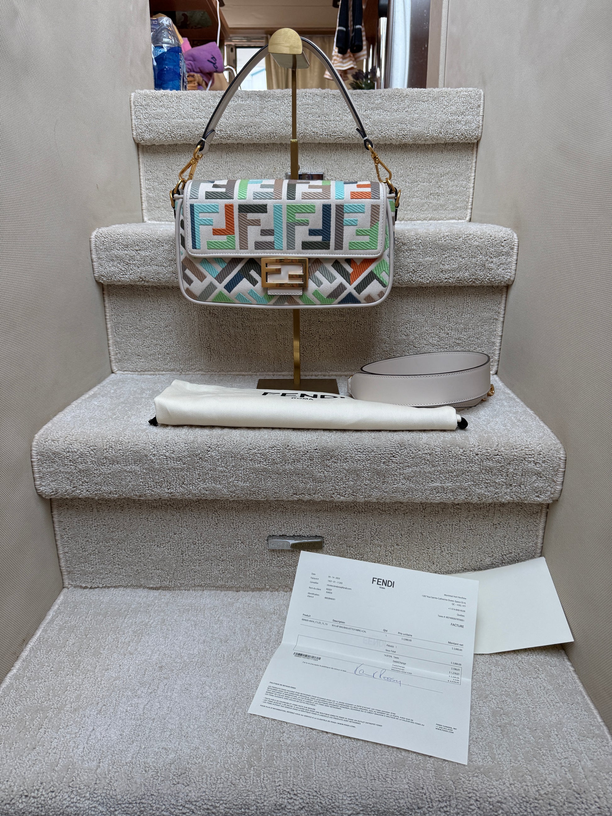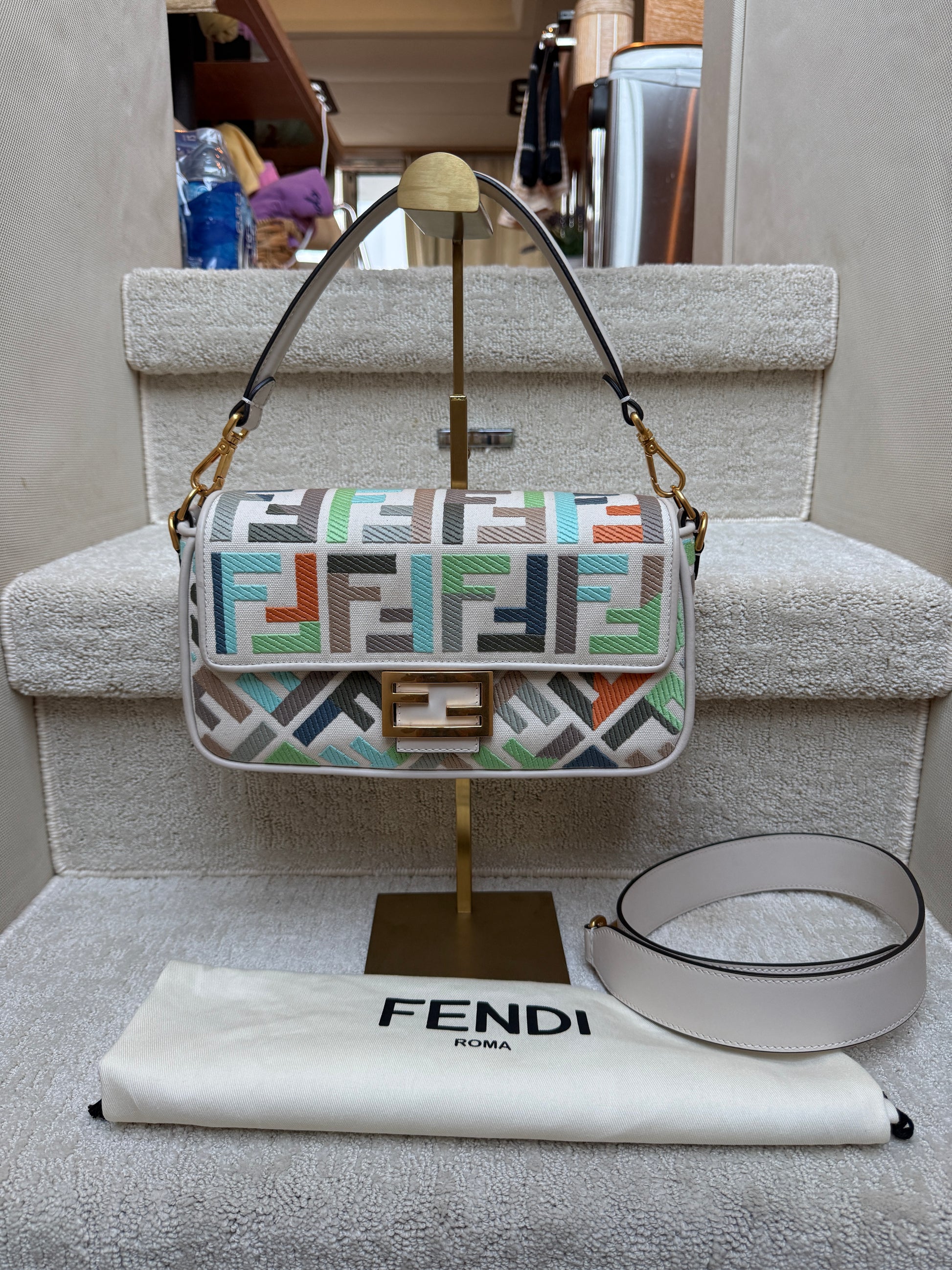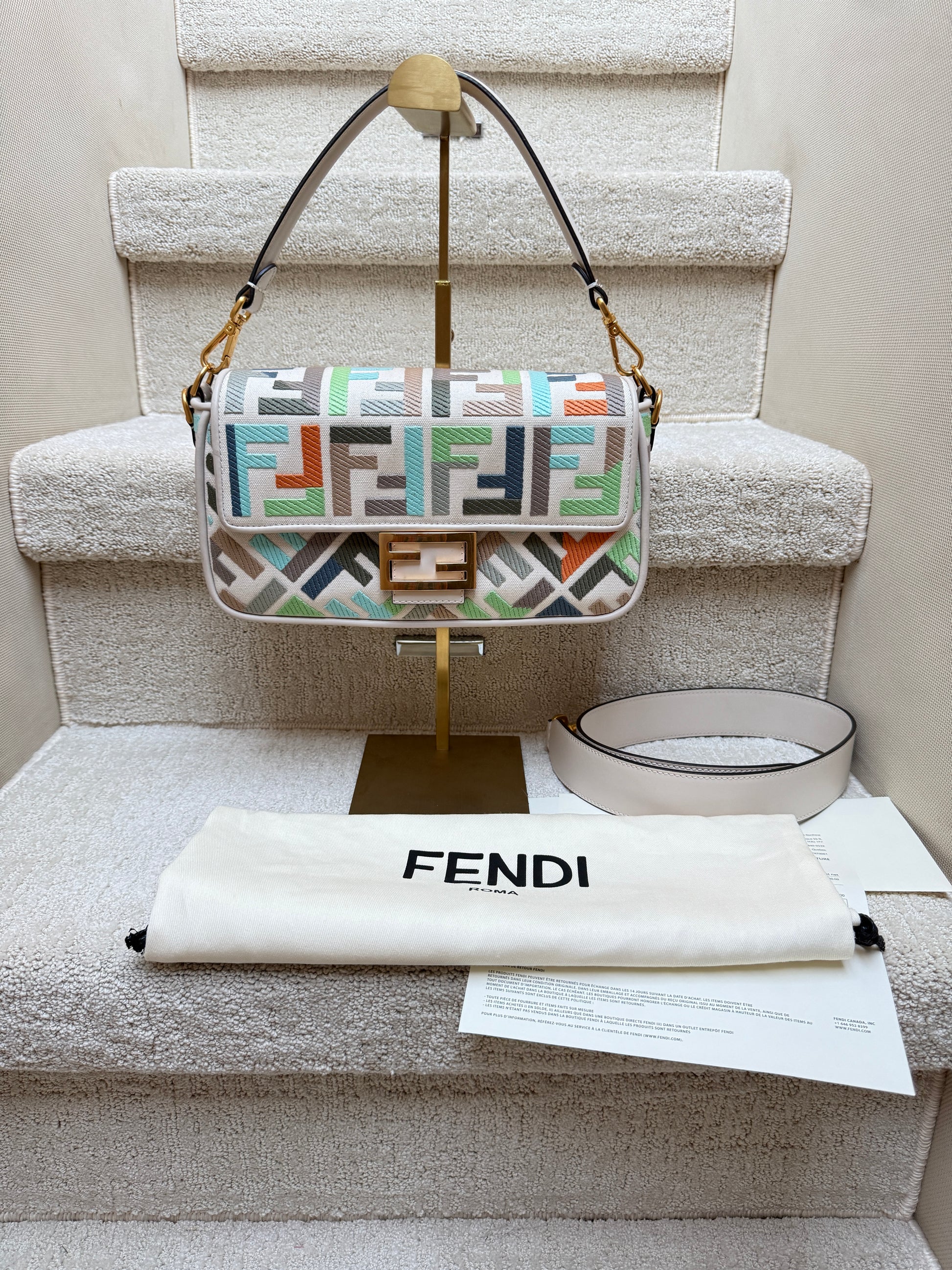 Fendi Canvas Vitello Seta FF Embroidered Baguette in pastel