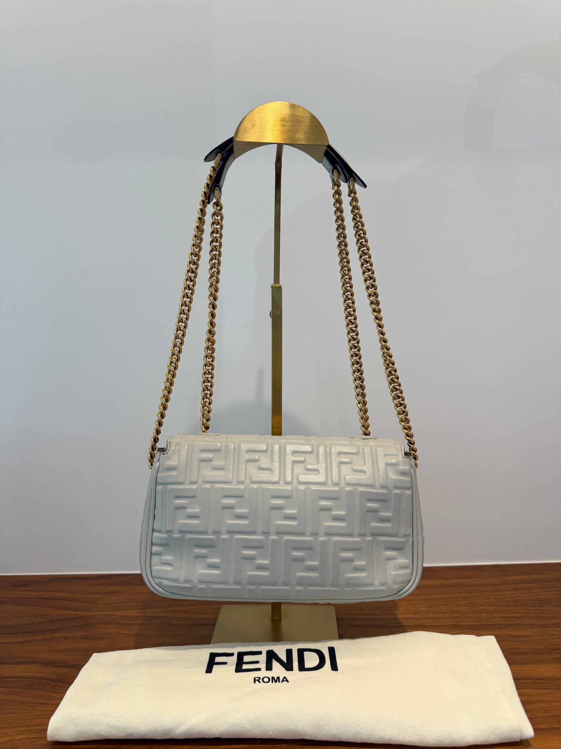 This is an authentic FENDI Nappa Small FF Embossed Midi Chain Baguette in Ghiaia. This baguette is crafted of Fendi monogram-embossed lambskin leather in grey. It features gold chain straps with leather shoulder pads and a prominent FF logo on the front. The flap opens with a magnetic snap to a grey leather interior with a zippered pocket.