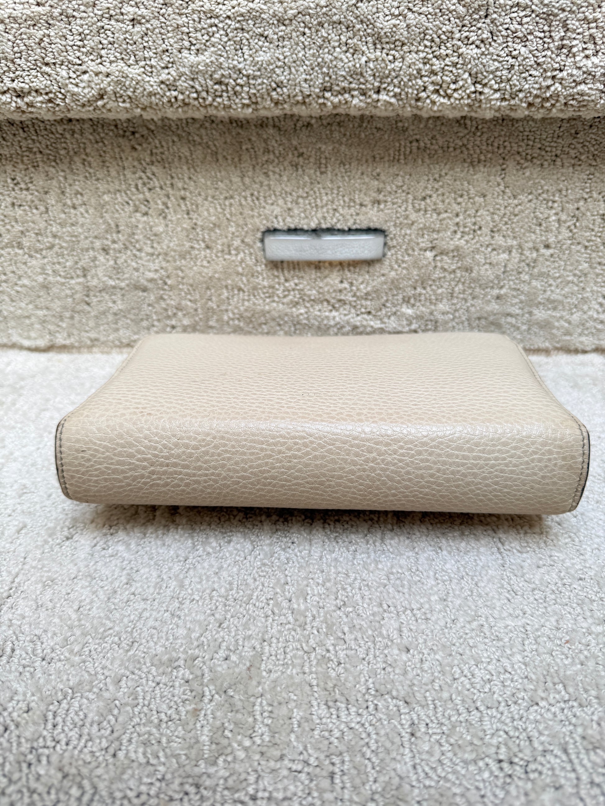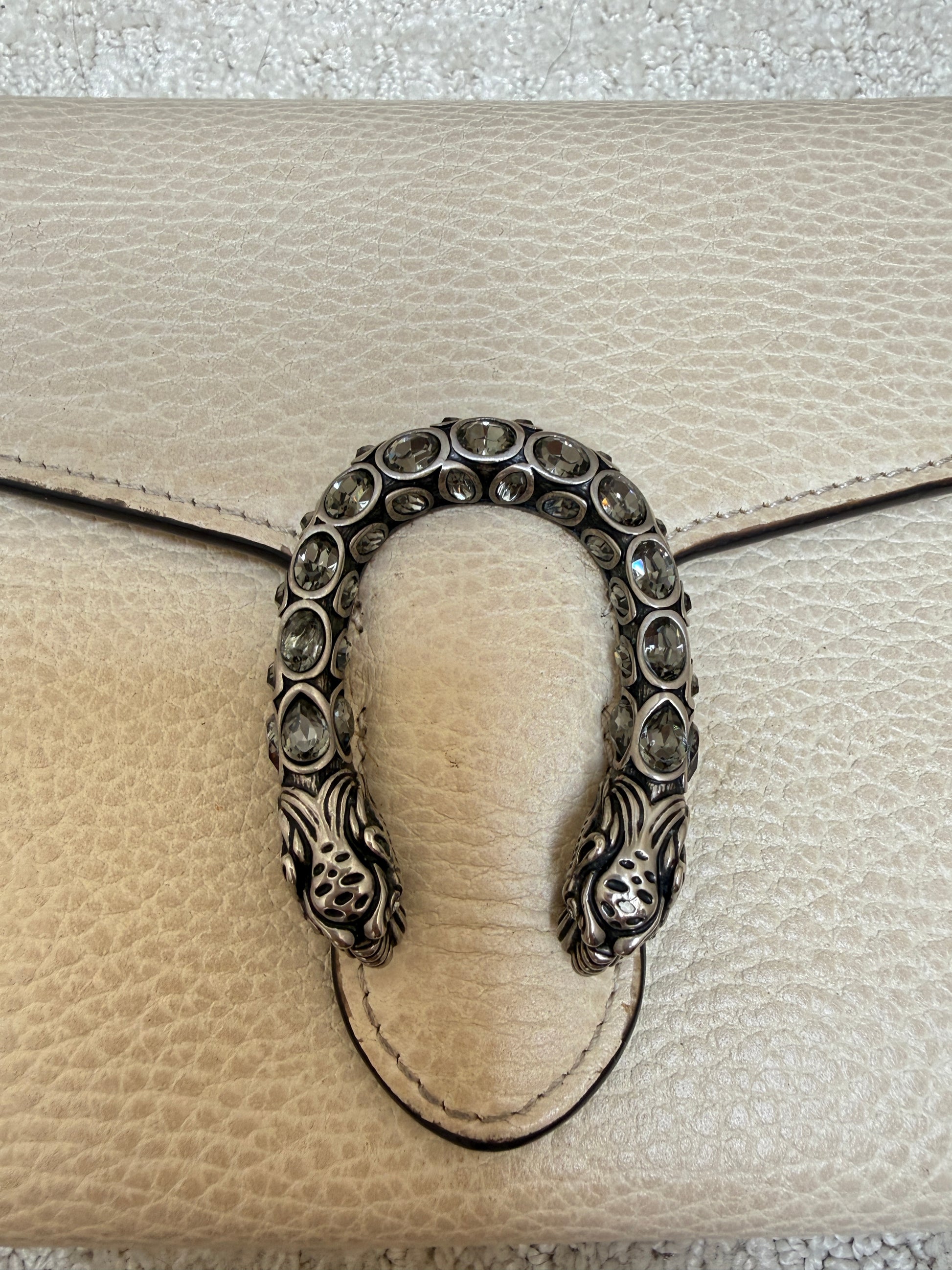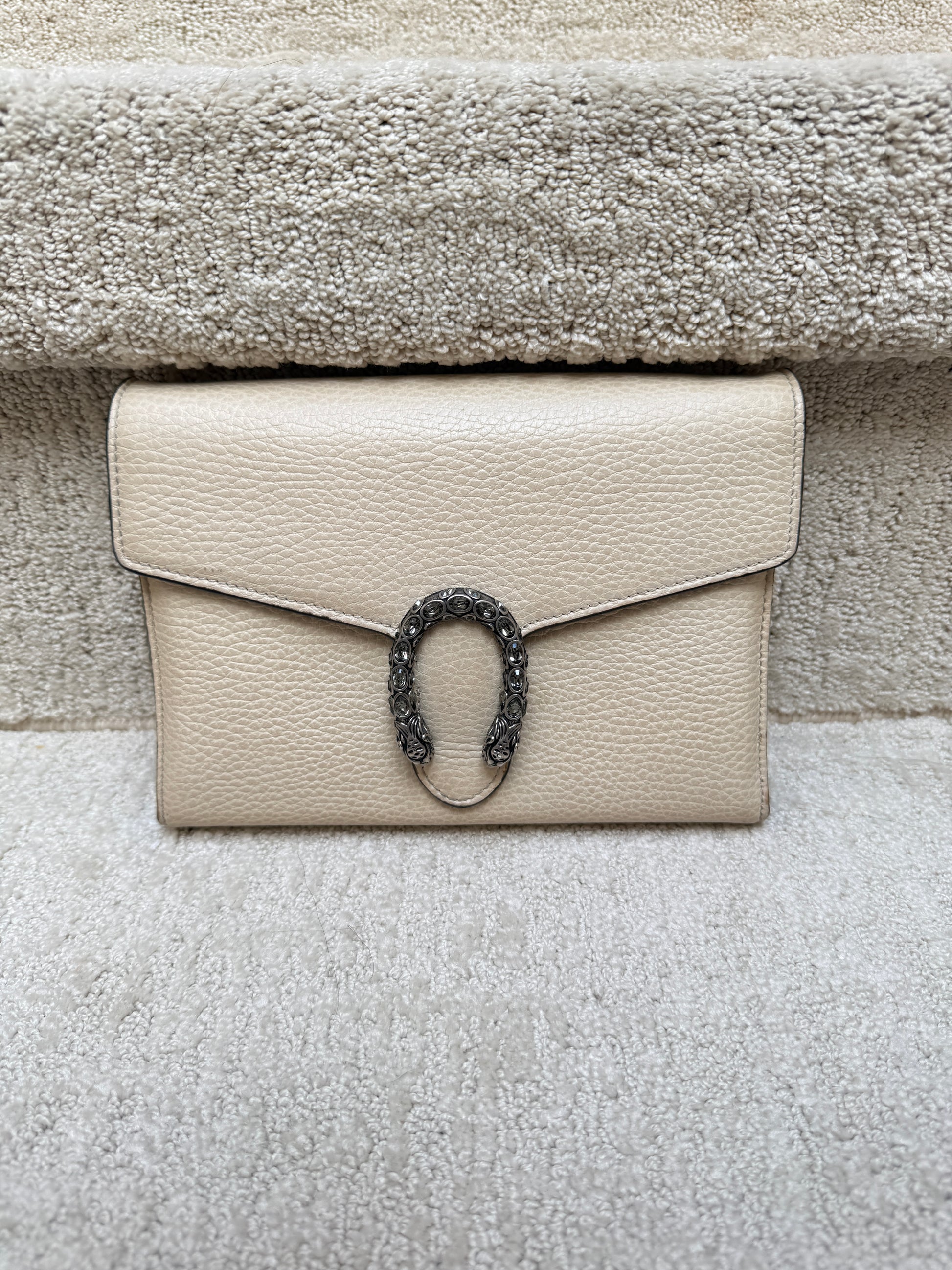 This is an authentic preloved GUCCI Calfskin Dionysus Wallet on Chain in Mystic White. This stylish bag is crafted of grained calfskin leather in off white. This bag features a optional silver chain shoulder strap and a crystal encrusted horseshoe closure with feline heads at the end. This opens to an off white leather and pink fabric interior, card slots, zipper compartment and patch pockets.