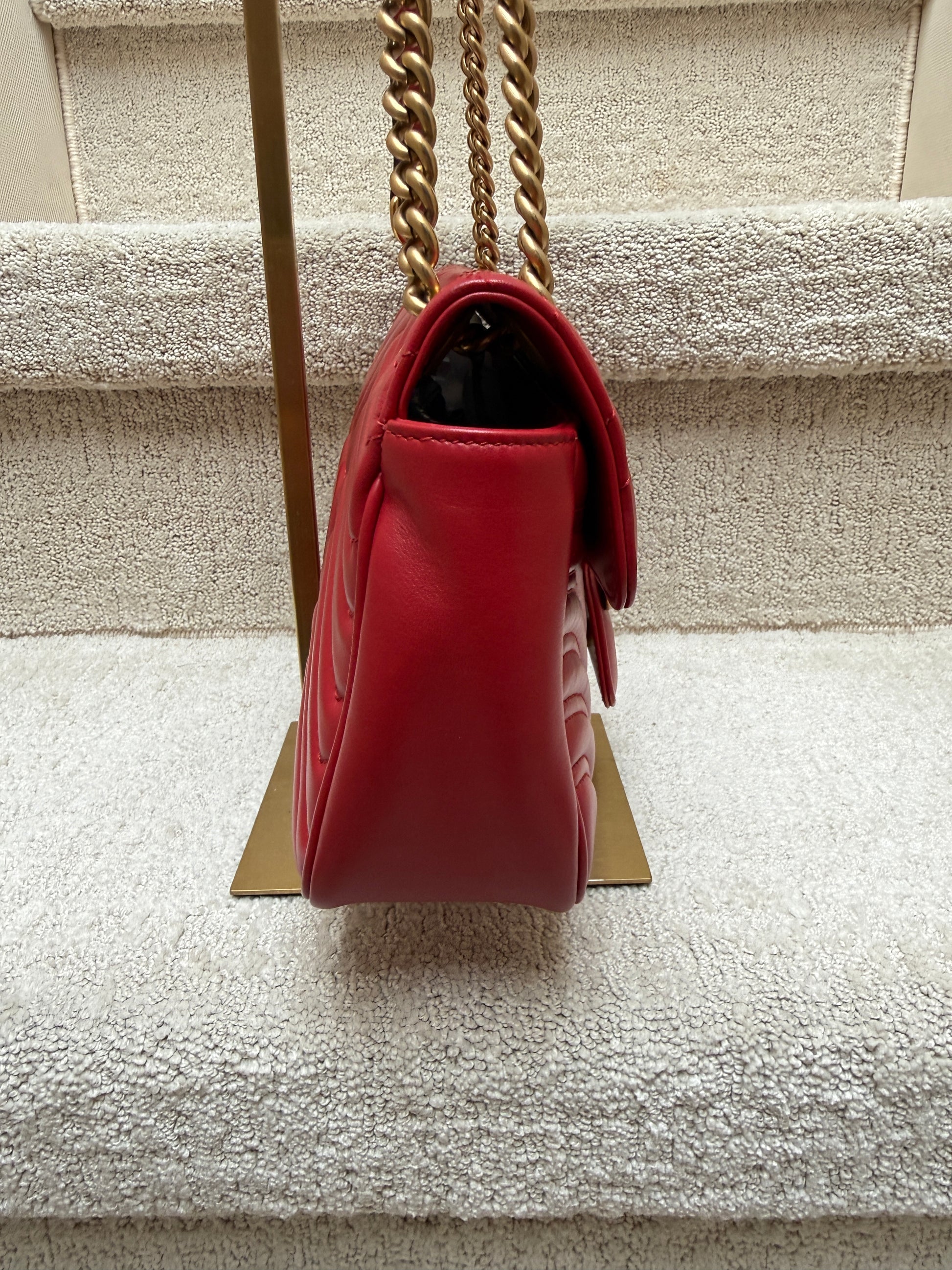 This is an authentic GUCCI Calfskin Matelasse Small GG Marmont Shoulder Bag in Hibiscus Red. This shoulder bag is crafted of smooth and supple quilted calfskin leather in red. This bag features an aged gold chain and a leather shoulder strap. The front flap has a double GG logo and opens to a beige microfiber interior with a zipper pocket.