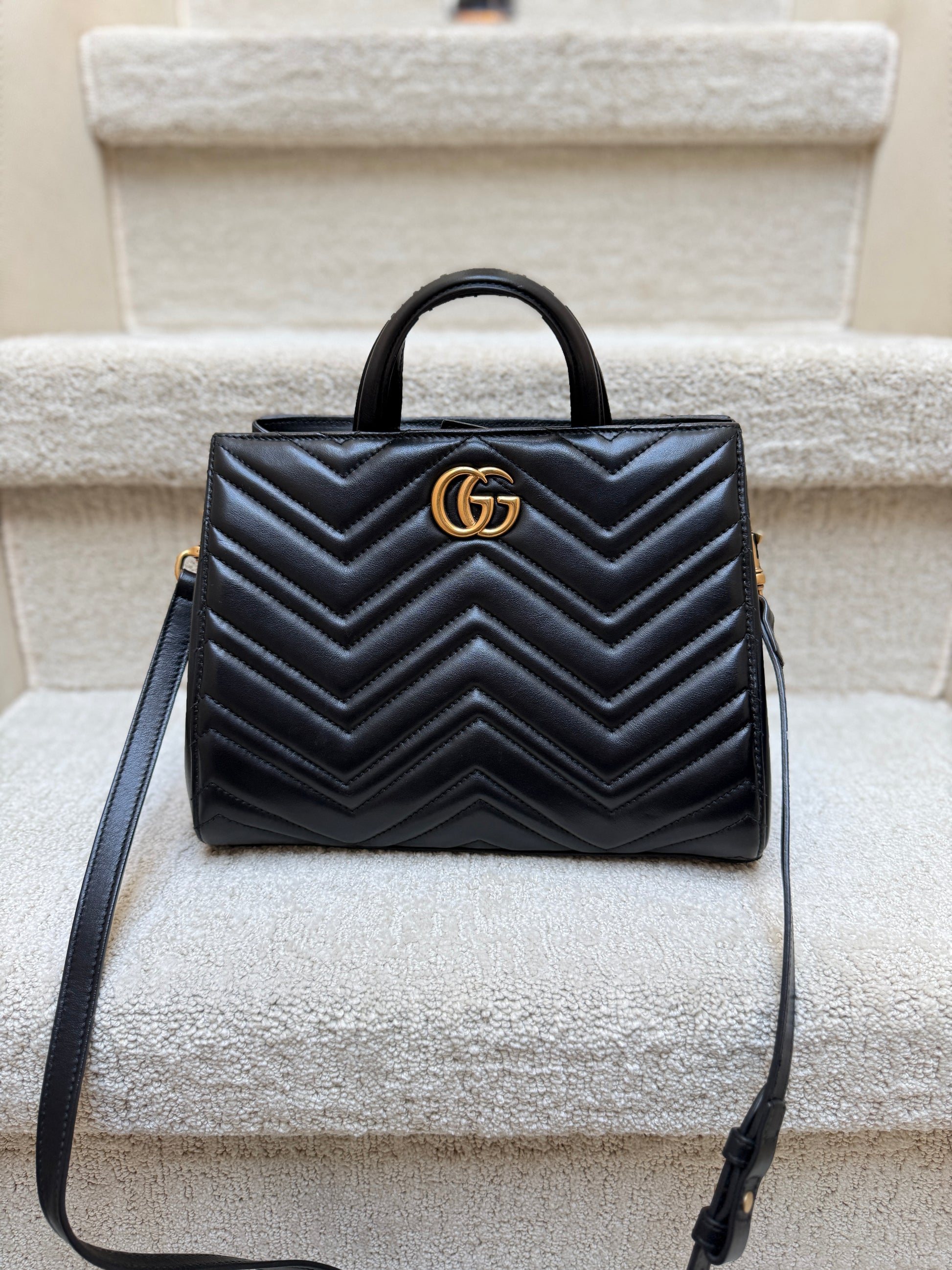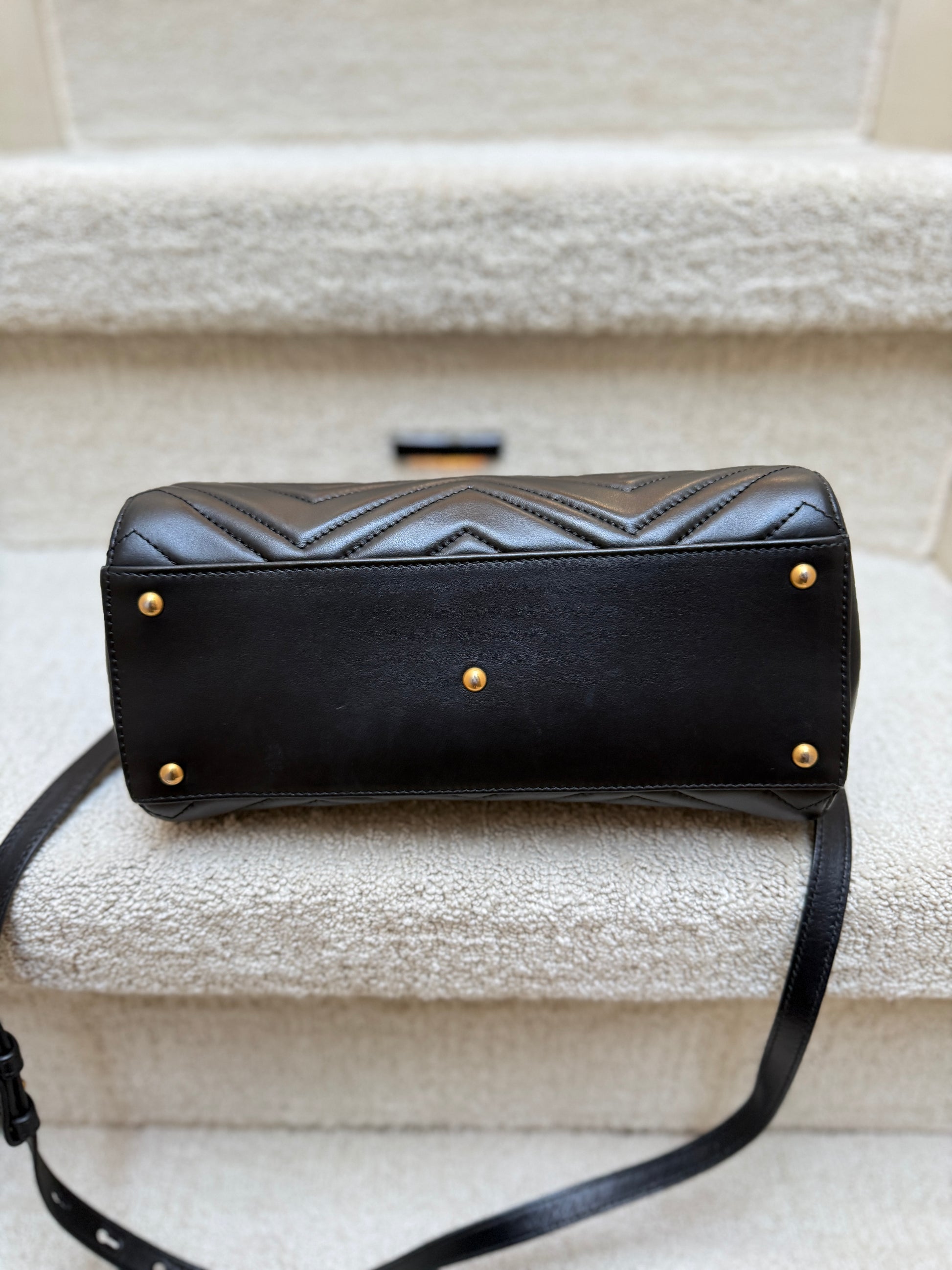 This is an authentic preloved GUCCI Calfskin Matelasse Small GG Marmont Tote in Black. This shoulder bag is crafted of smooth and supple calfskin leather. This bag features a leather adjustable shoulder strap, matching handles and a front interlocking aged gold GG logo. The top opens to a beige microfiber interior with zipper and patch pockets.