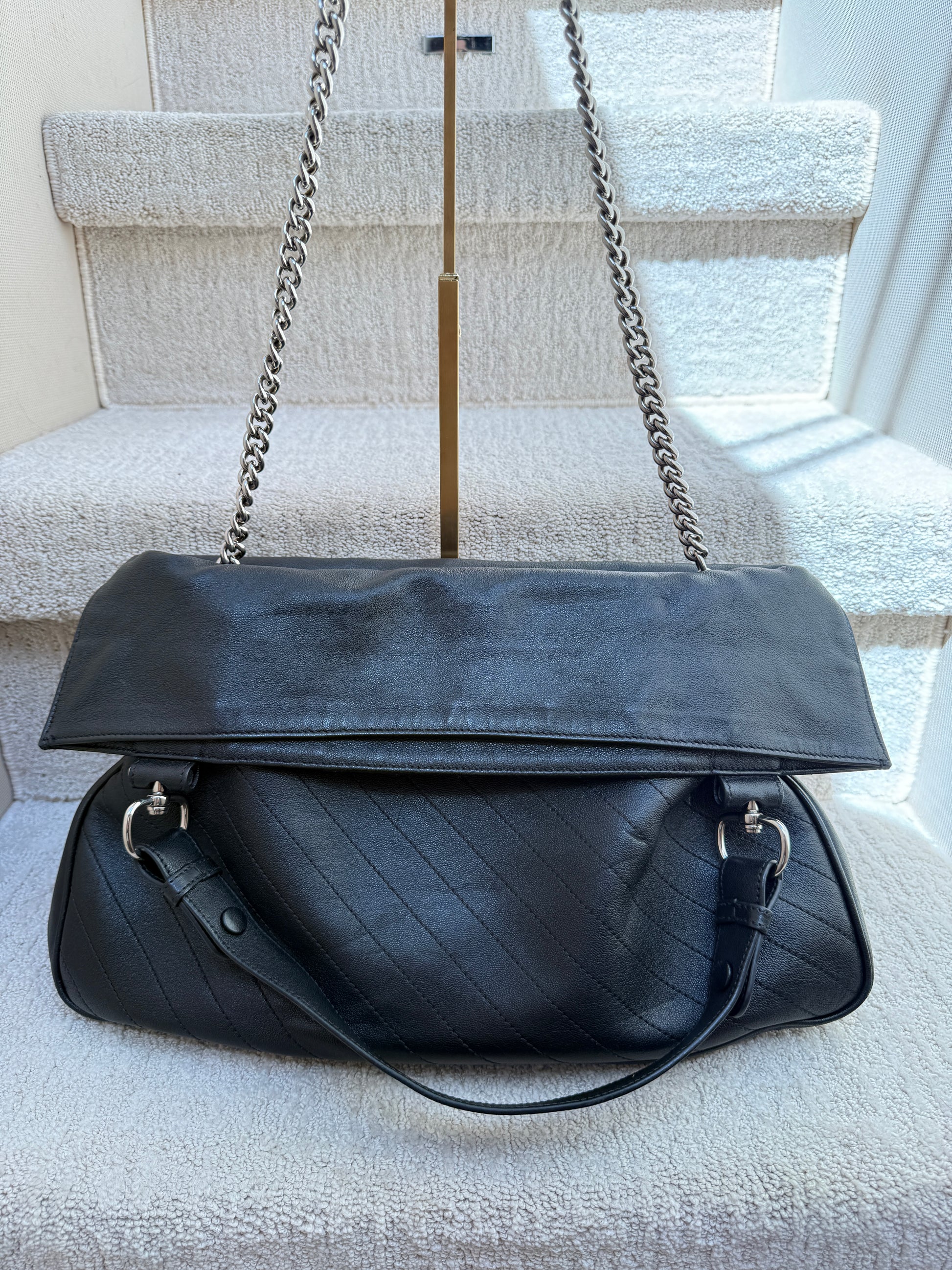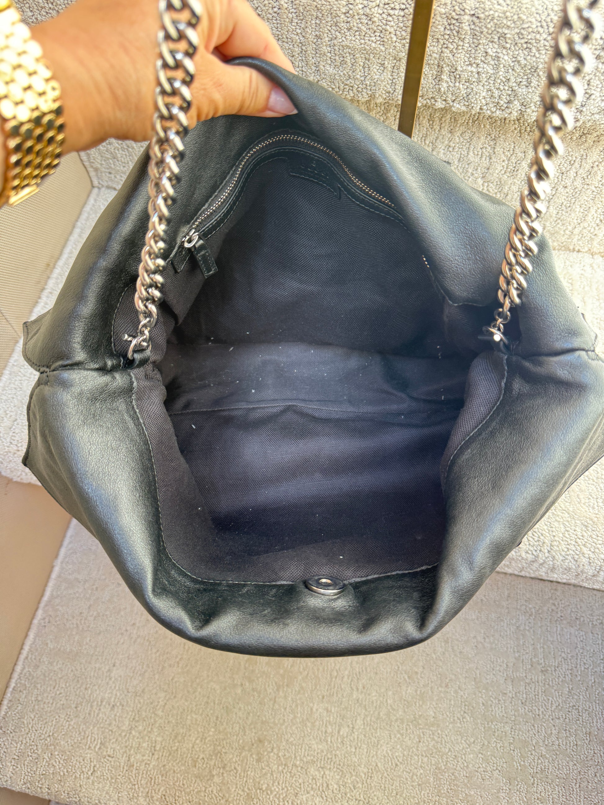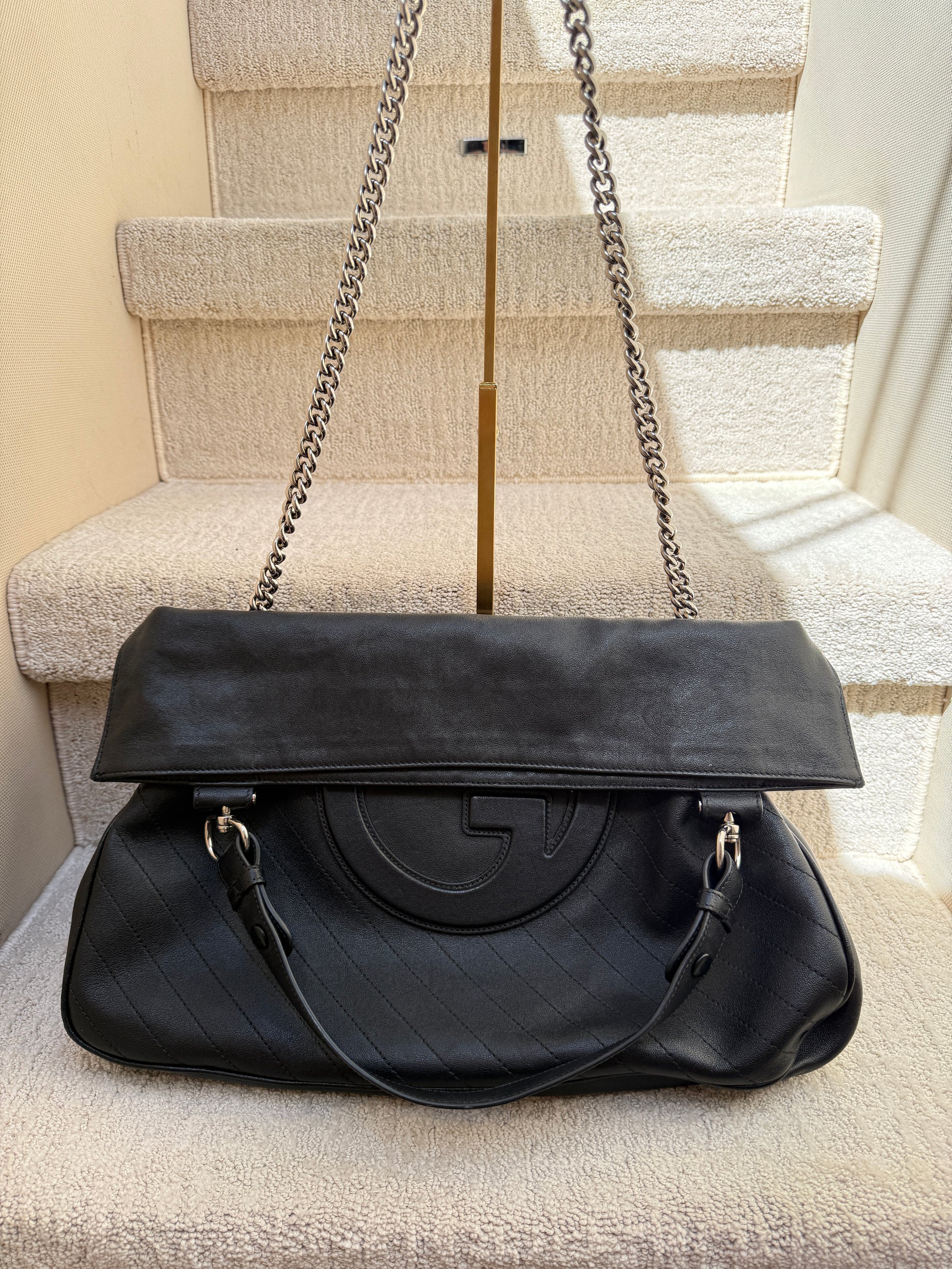 This is an authentic GUCCI Sakai Be Green Calfskin Diagonal Stitched Blondie Tote in Black. This stylish shoulder bag is crafted of black calfskin leather. The tote features matching strap handles, an optional silver chain shoulder strap, and an interlocking GG logo. The top opens to a 3 partitioned black fabric interior with a zipper pocket.