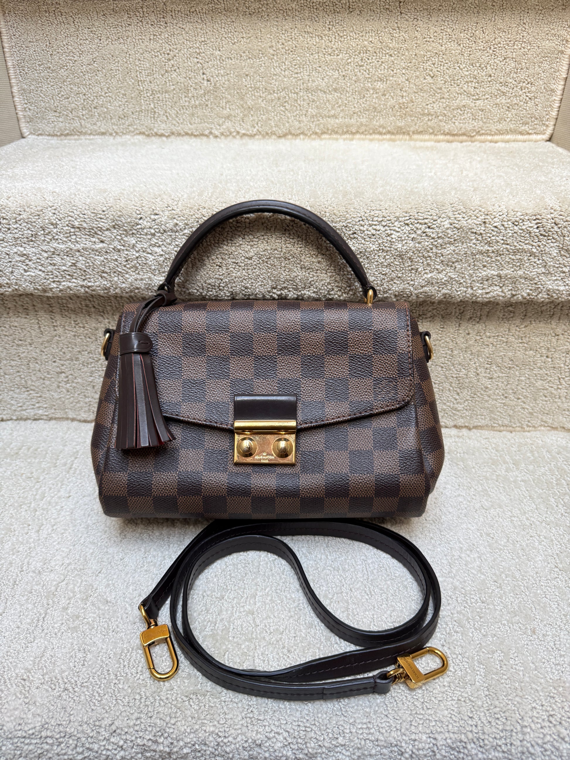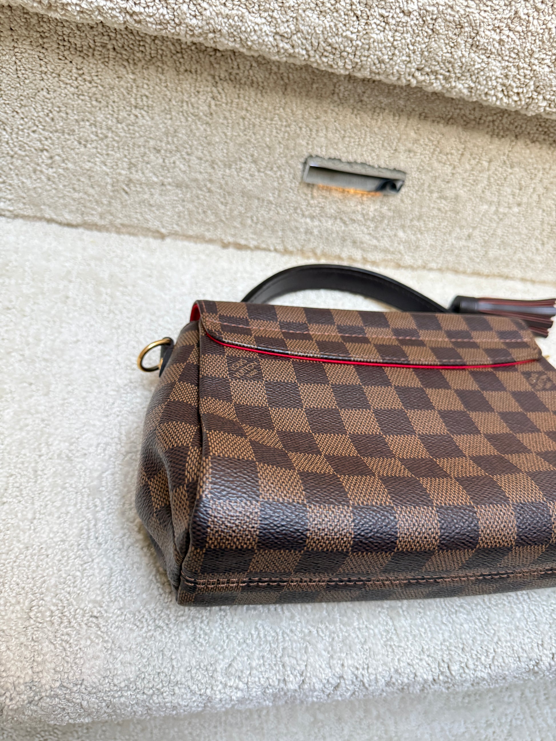 This is an authentic LOUIS VUITTON Damier Ebene Croisette. This handbag is crafted of Louis Vuitton checkerboard coated canvas in brown. The bag features signature leather trim including a top handle, a removable tassel, and a removable shoulder strap with brass hardware. The crossover flap opens with an s-lock to a red fabric interior with a patch pocket.