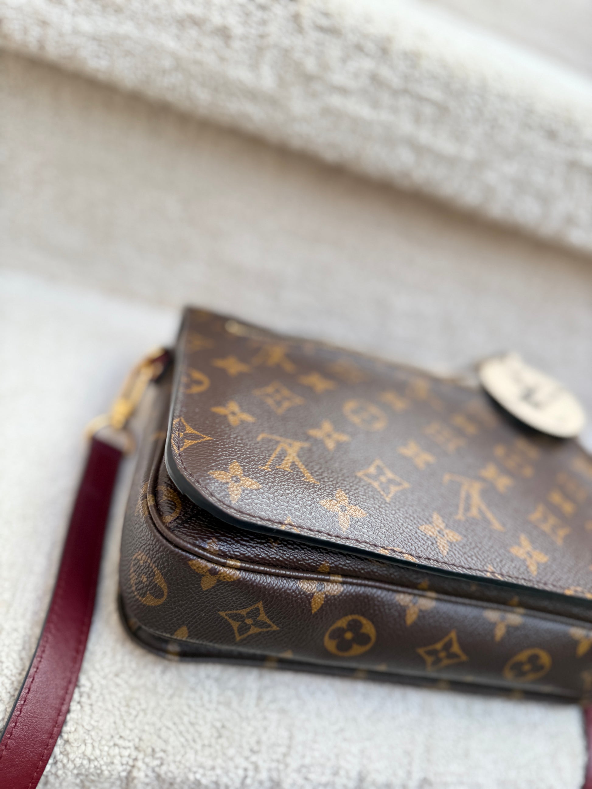 This is an authentic Preloved LOUIS VUITTON Monogram Pochette Metis. This chic handbag is finely crafted of classic Louis Vuitton monogram toile canvas. It features a braided top handle and an adjustable burgundy leather shoulder strap that is perfect for hands-free convenience. This adorable Pochette Metis features an exterior zip pocket, the iconic LV S-lock, and a spacious interior with several compartments. This particular Metis style features a thick braided top handle and comes with a cute LV monogram bag charm. Perfect for every day use!