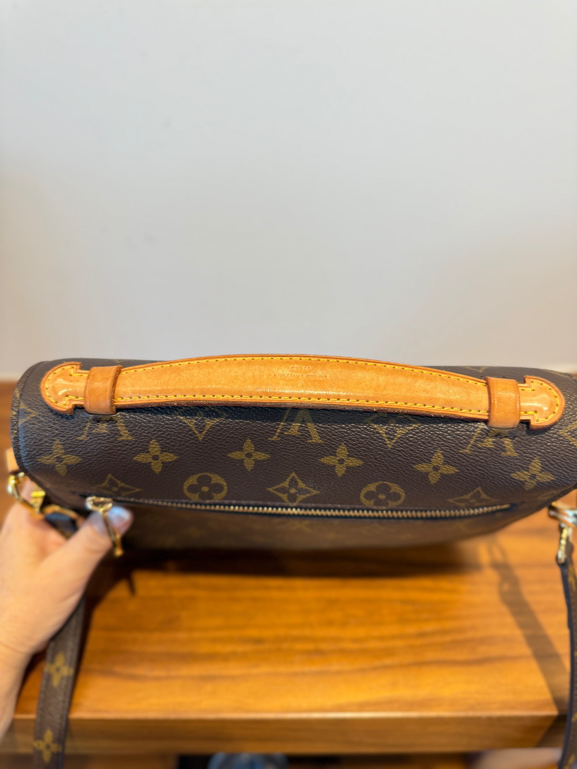 This is an authentic pre-owned LOUIS VUITTON Monogram Pochette Metis. This chic handbag is finely crafted of classic Louis Vuitton monogram toile canvas. The bag features a vachetta cowhide leather handle, an optional, adjustable monogram coated canvas shoulder strap, and a rear zipper pocket. The crossover flap opens with a polished gold plated S-lock to a partitioned brown microfiber interior.