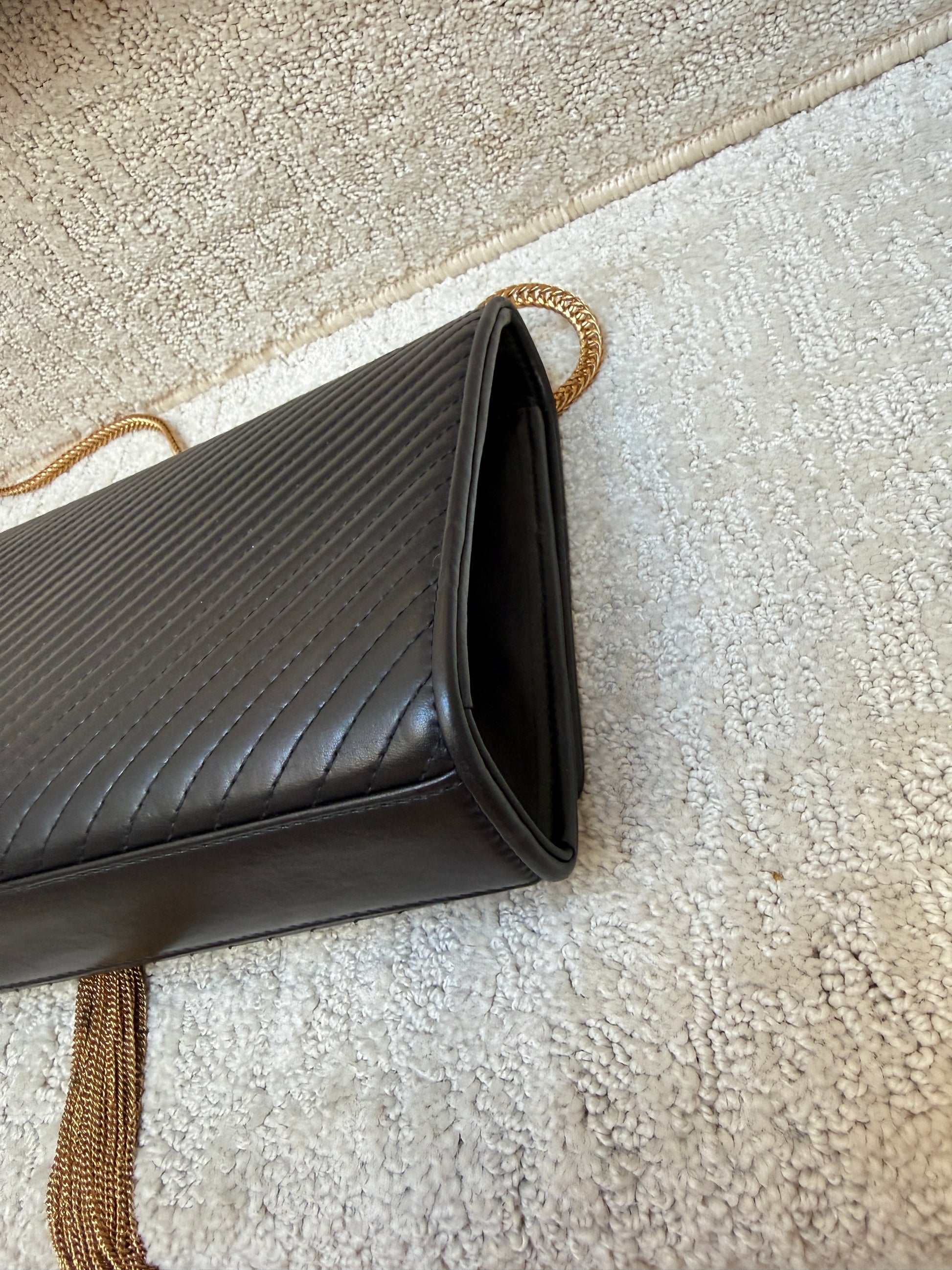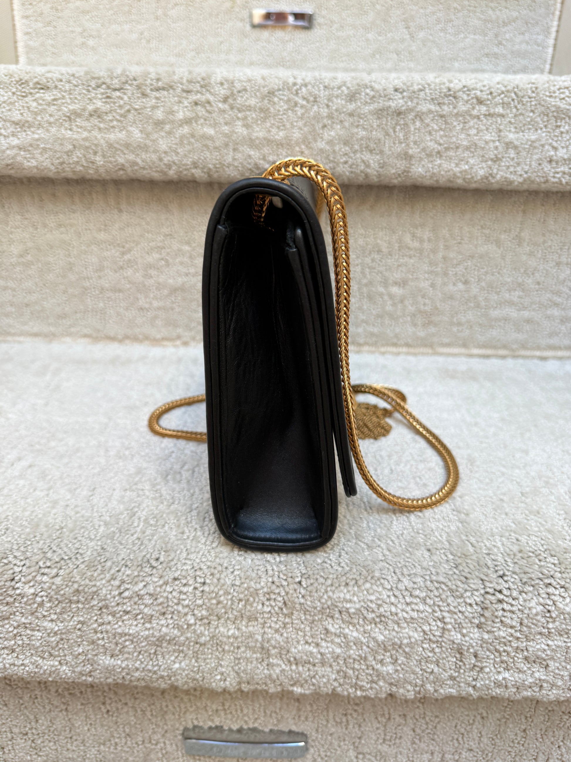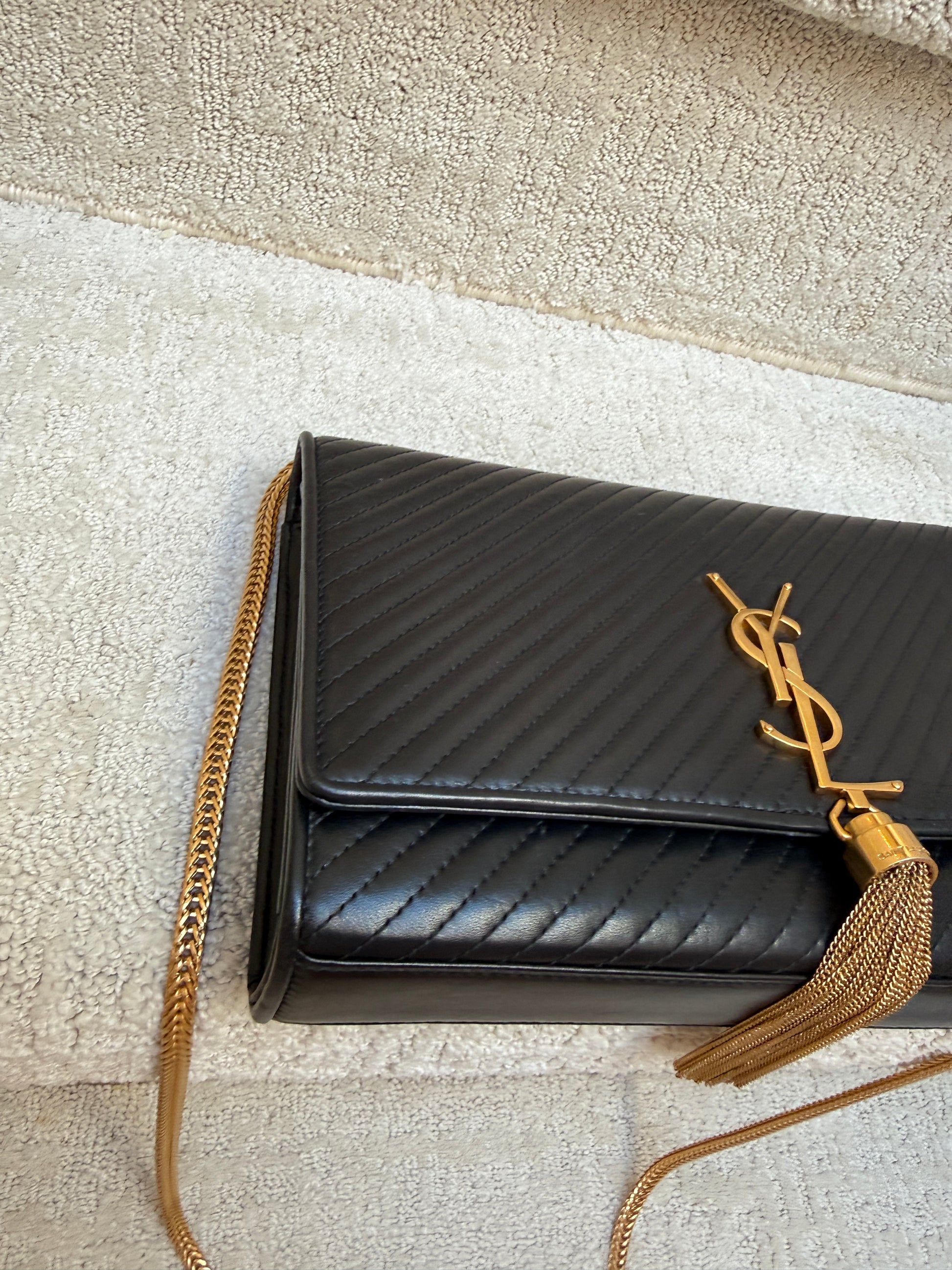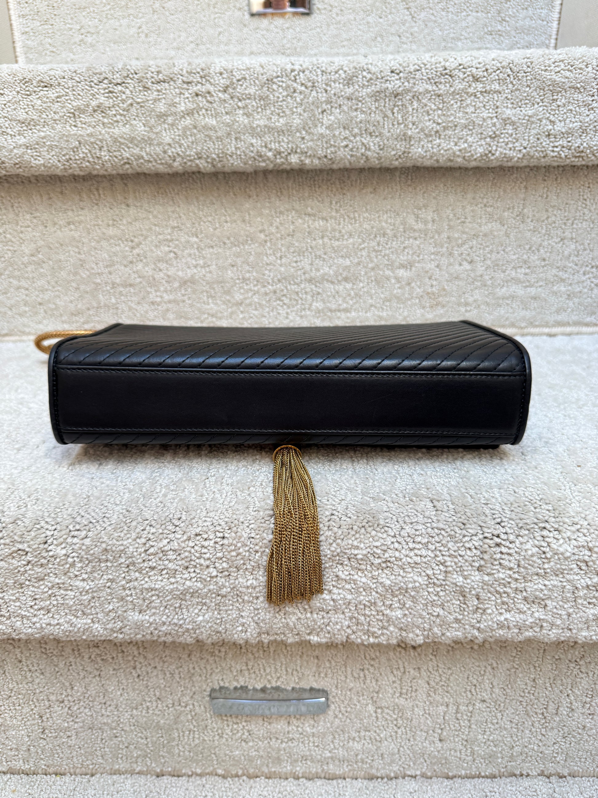 This is an authentic SAINT LAURENT Grain De Poudre Medium Classic Monogram Kate Tassel Satchel in Black. This ultra-stylish evening clutch is crafted of pebbled calfskin leather in black. The bag features a gold bijoux chain strap and a front flap with a gold YSL logo and hanging tassel. The flap opens to a black leather and fabric interior with a patch pocket.